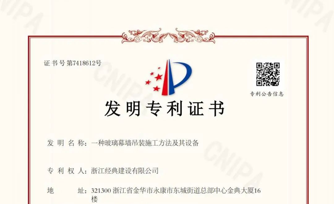 Recently, Zhejiang Classic Construction Co., LTD. 's "A glass curtain wall hoisting method and equipment" was authorized by the State Intellectual Property Office invention patent, marking the company has made another major breakthrough in the field of technological innovation. This is not only the second invention patent granted by the company this year, but also a strong proof of its technical strength.